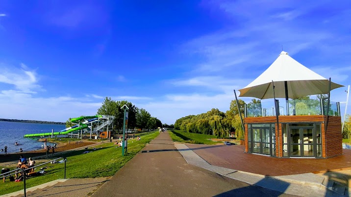 A közel fél kilométeres parton ligetes és napos részek váltják egymást. A kisgyermekkel érkezőket lassan mélyülő, gyermekbarát partszakasz várja.